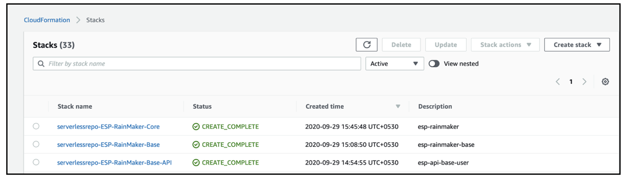 serverlessrepo-ESP-RainMaker-Corestack.CREATE_COMPLETEstatus indicates that, this repository is successfully deployed, as shown below: