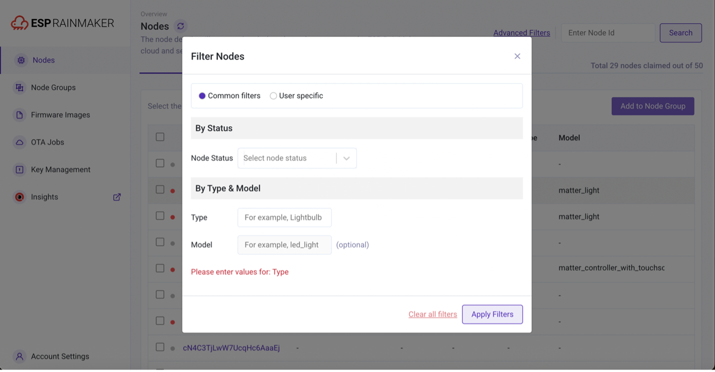 Users can filter nodes based on the Node Status or based on Type or by Model.