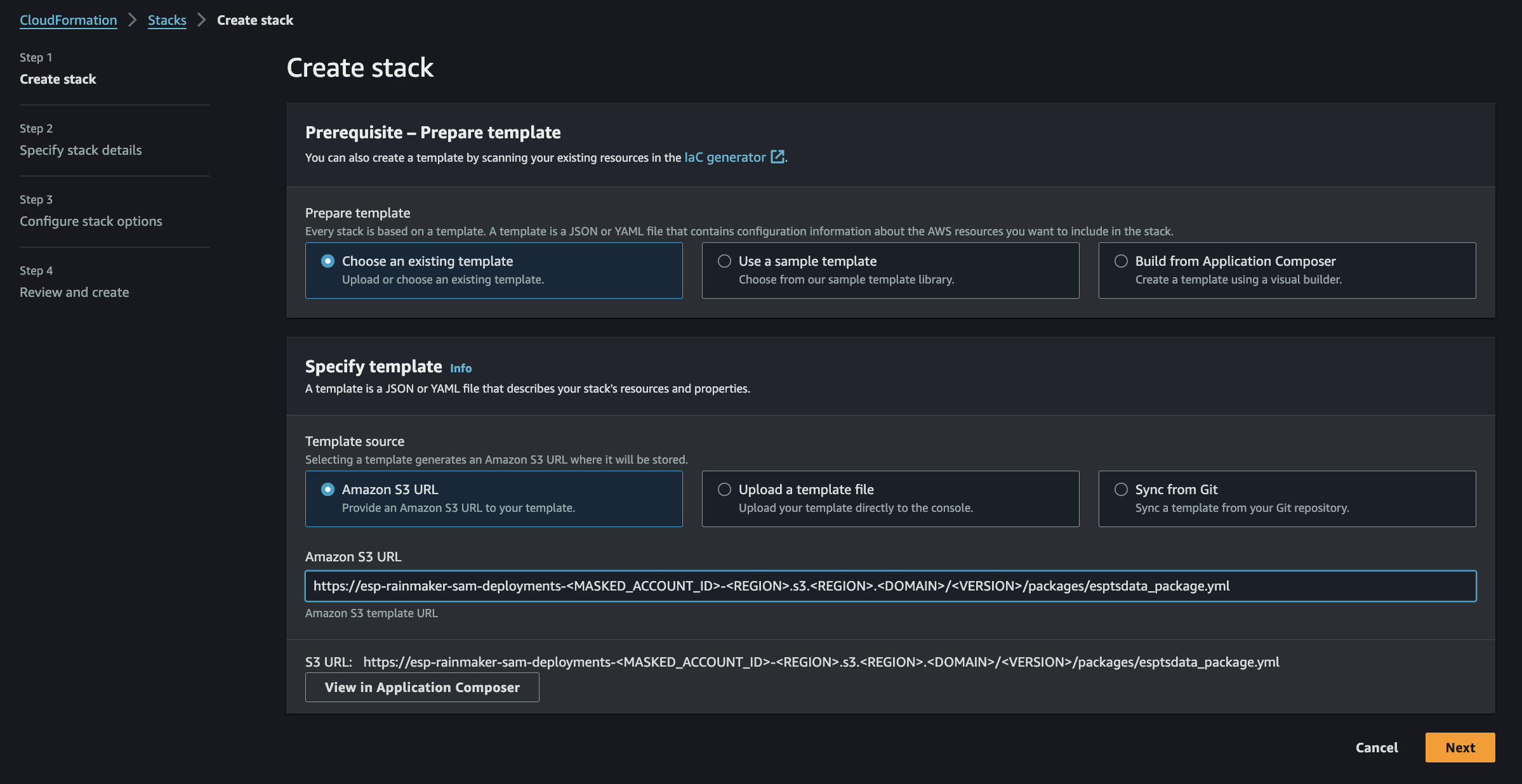时间序列服务的基础组件 ESP-Rainmaker-Base-TimeSeries 需要使用 CloudFormation 进行部署。以下是详细步骤。