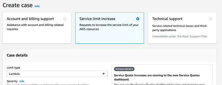 Service limit increase(请求增加服务使用配额),然后在Limit Type(配额类型)中选择Lambda,如下所示: