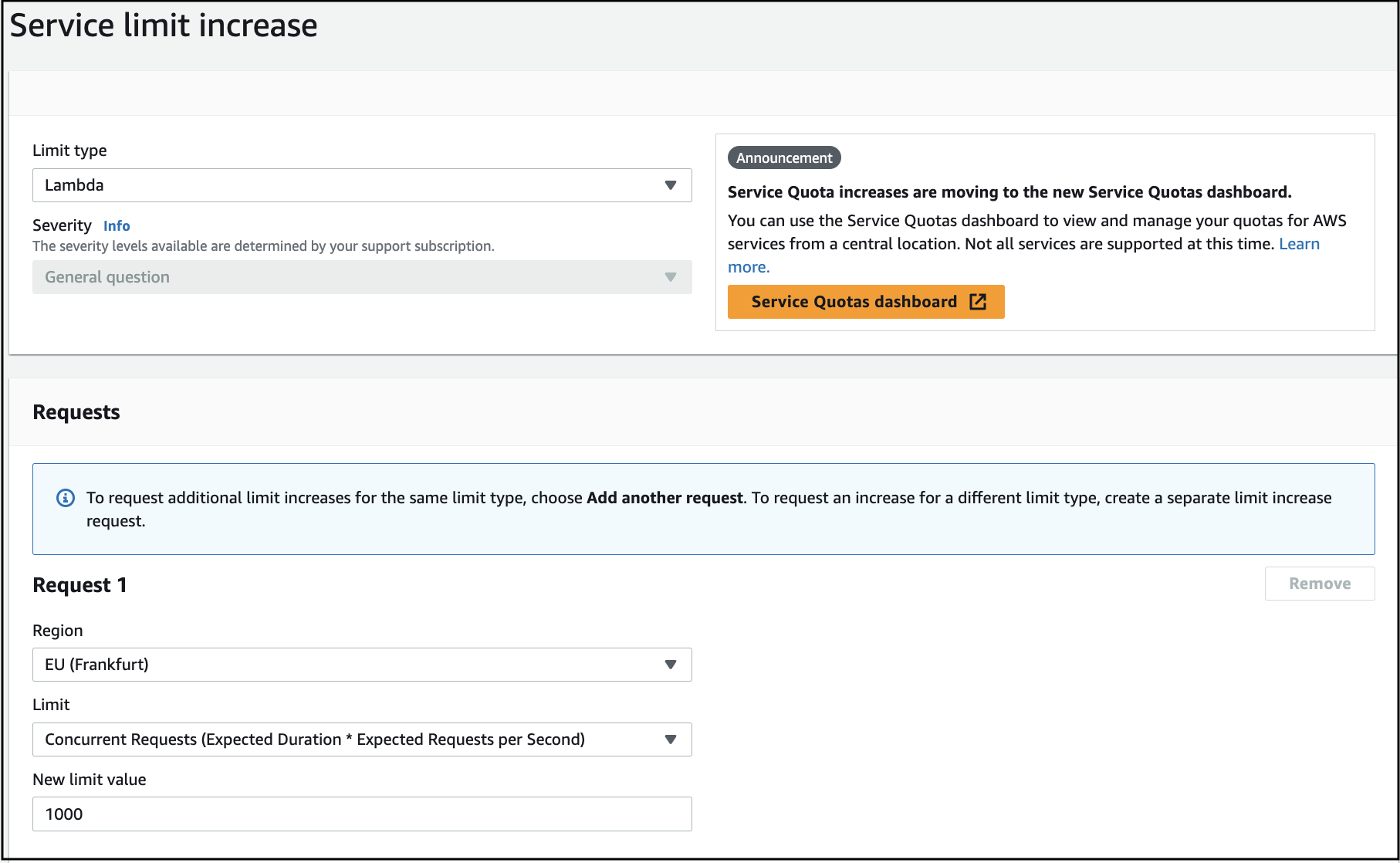 如果错误信息与上图类似,则问题可能与 Lambda 并发数配额相关。请向 AWS 提交支持请求以解决此问题。