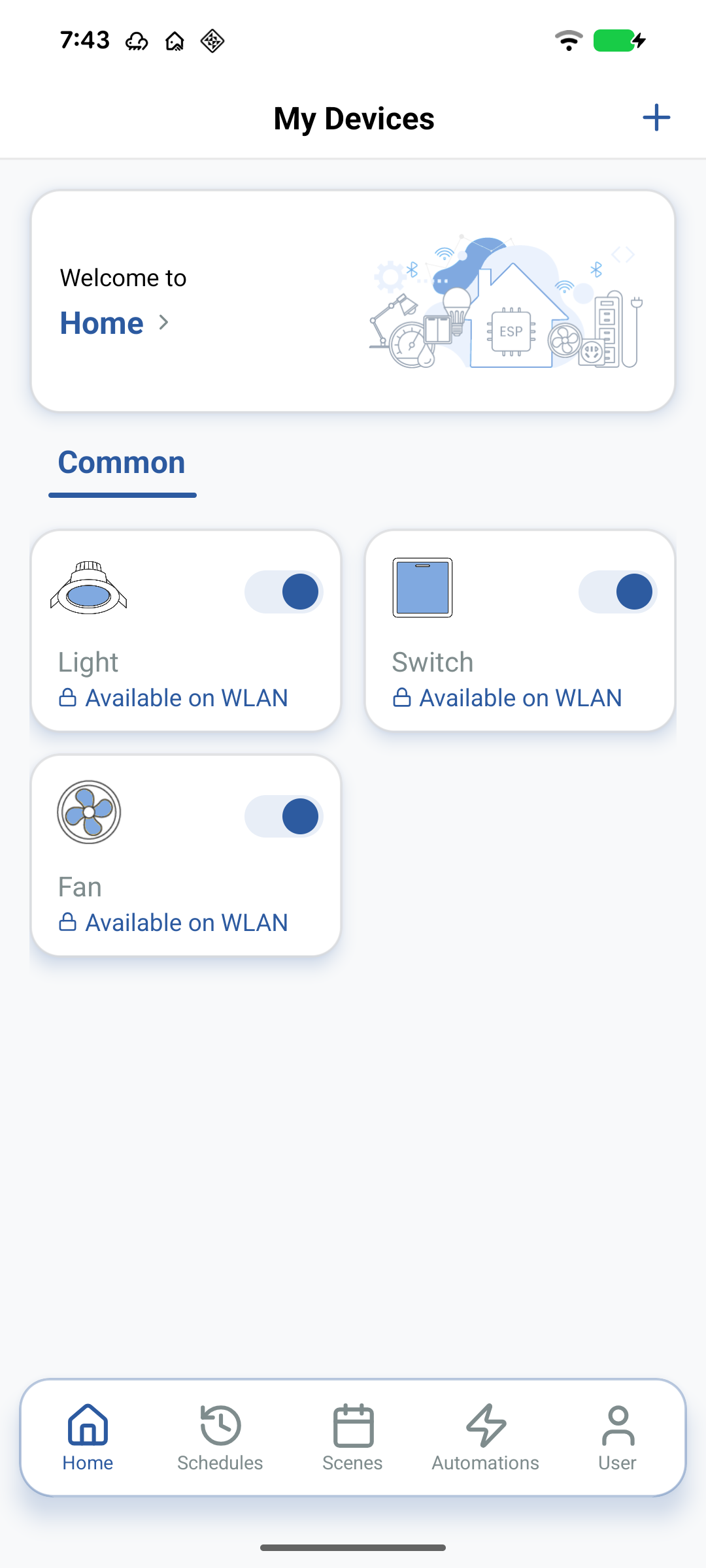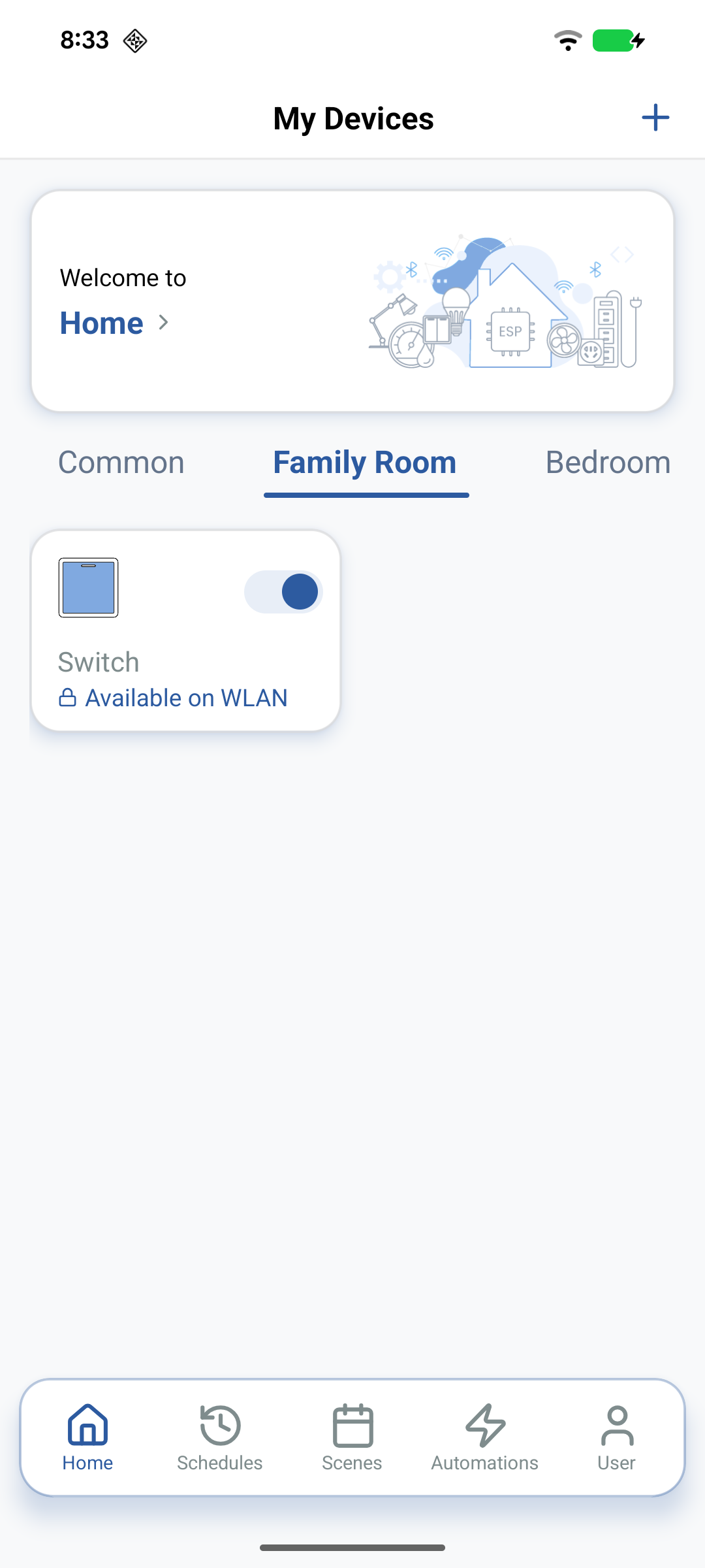 Devices are listed at the Home level. All devices under a particular home are displayed under the "Common" room by default. Users can create rooms under the home to organize devices by location.