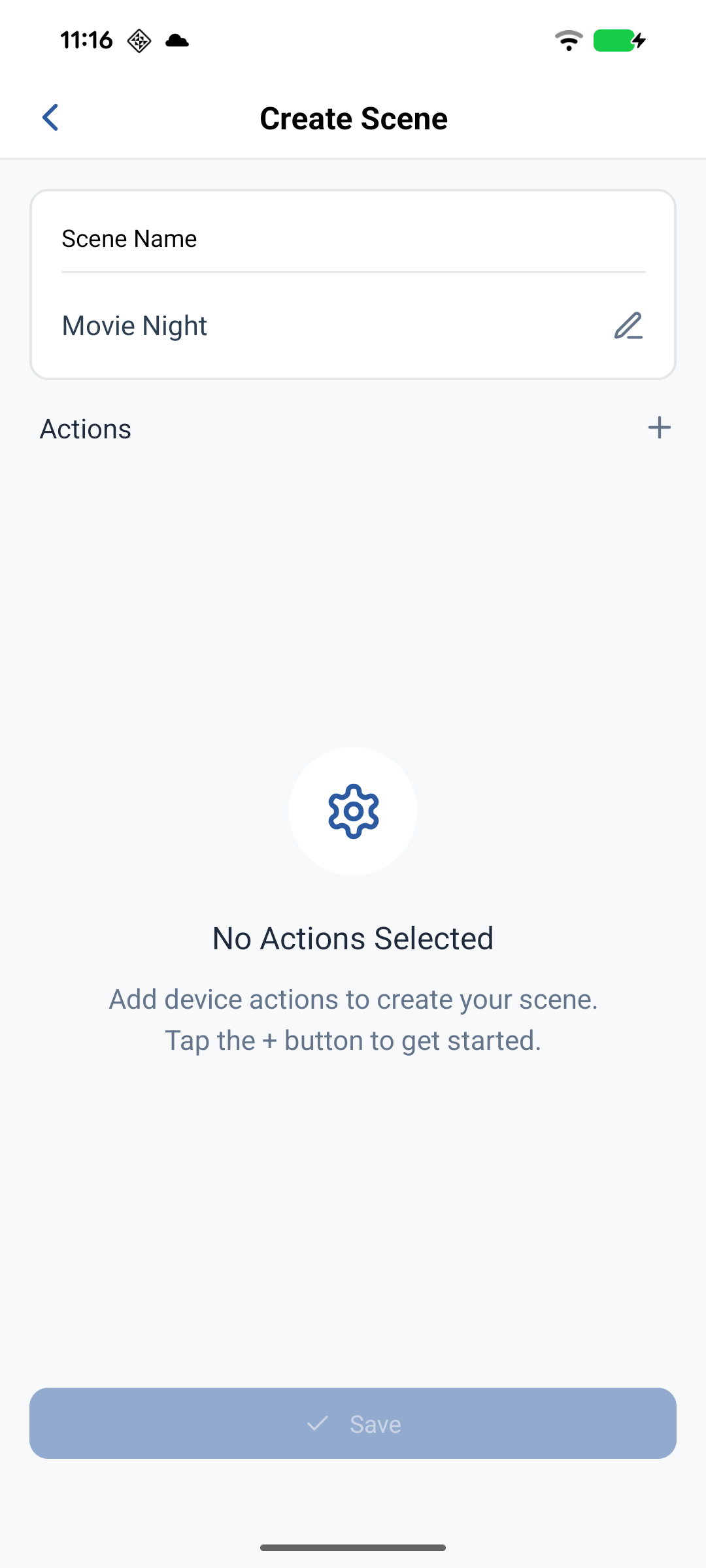 Create Scene - Tap the "Scenes" tab in the bottom navigation, tap the "+" button in the upper right corner.