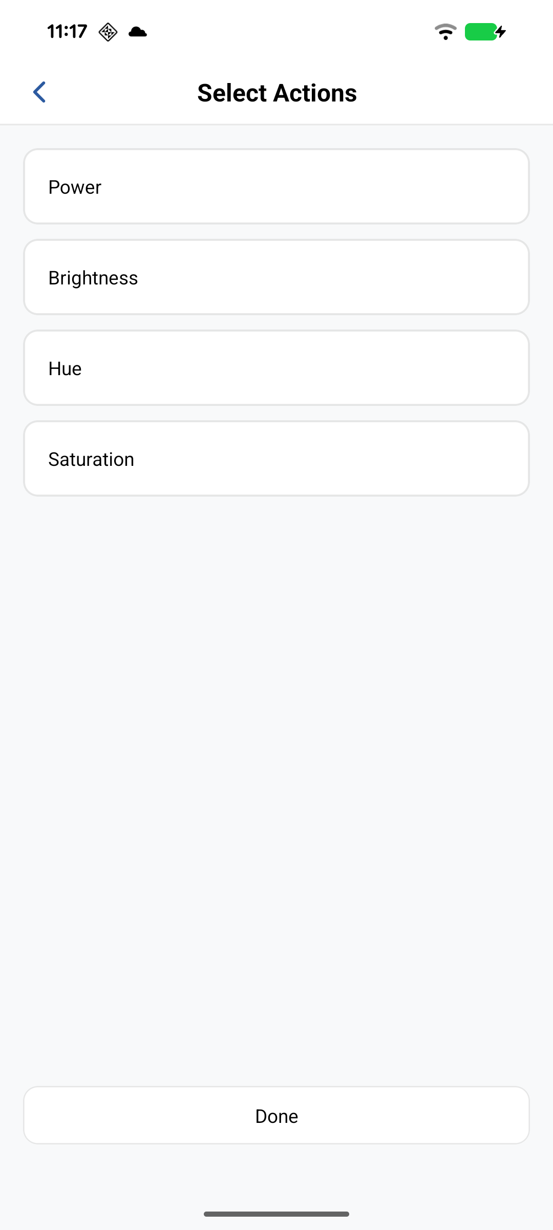 Add Device Actions - Tap the "+" button to select devices. Choose devices and configure their actions (on/off, brightness, color temperature, color, saturation, etc.).